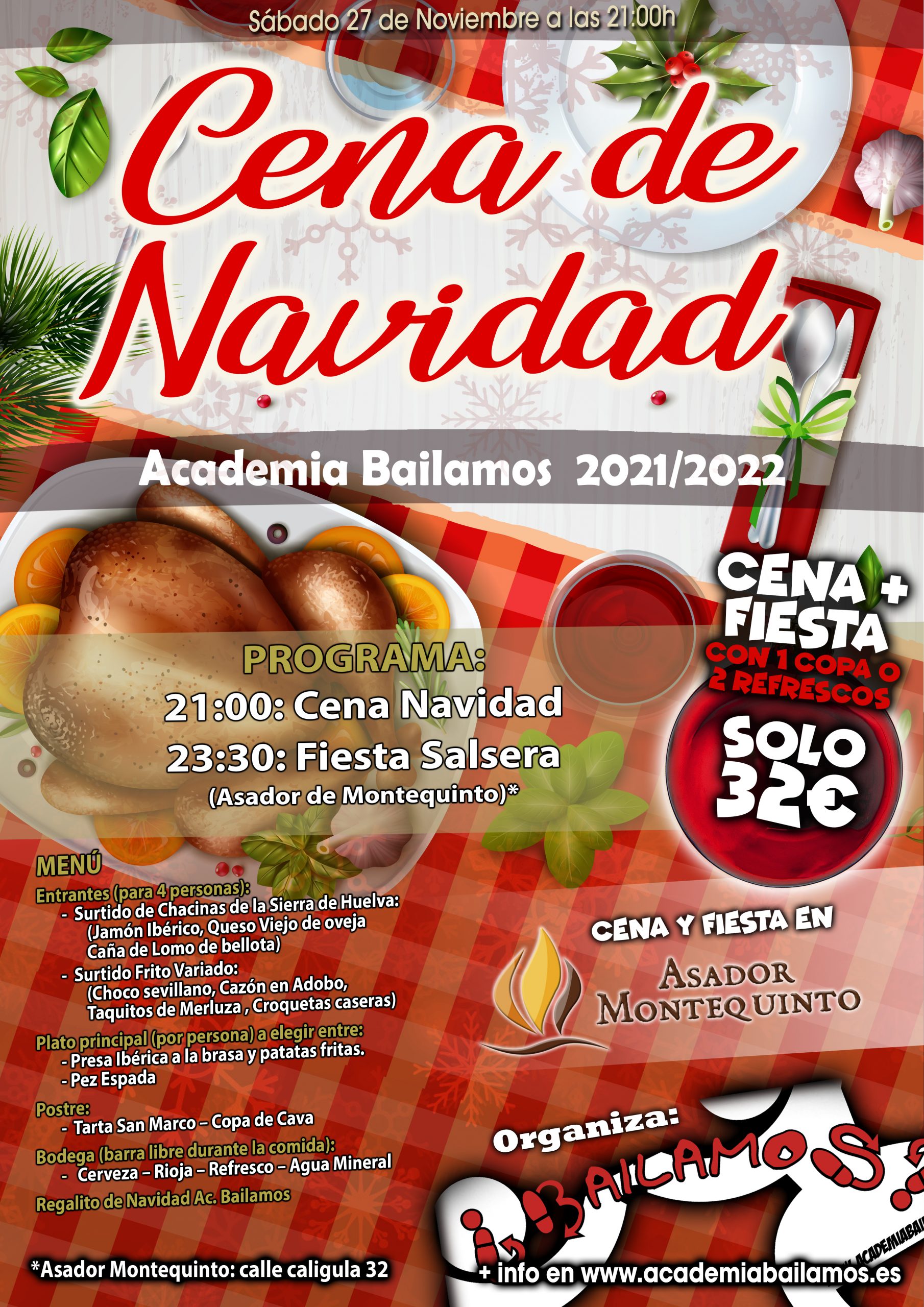 CENA - FIESTA NAVIDAD SALSERA 21/22 AC. BAILAMOS SÁBADO 27 DE NOVIEMBRE 2021 CENA + FIESTA (con 1 Copa o 2 refrescos) X SOLO 32€ Solo fiesta..... 6€ (Copa o 2 refr.) SALSA • BACHATA • KIZOMBA • Animaciones • Ruedas • la cena y la fiesta será este año en el EN ASADOR DE...